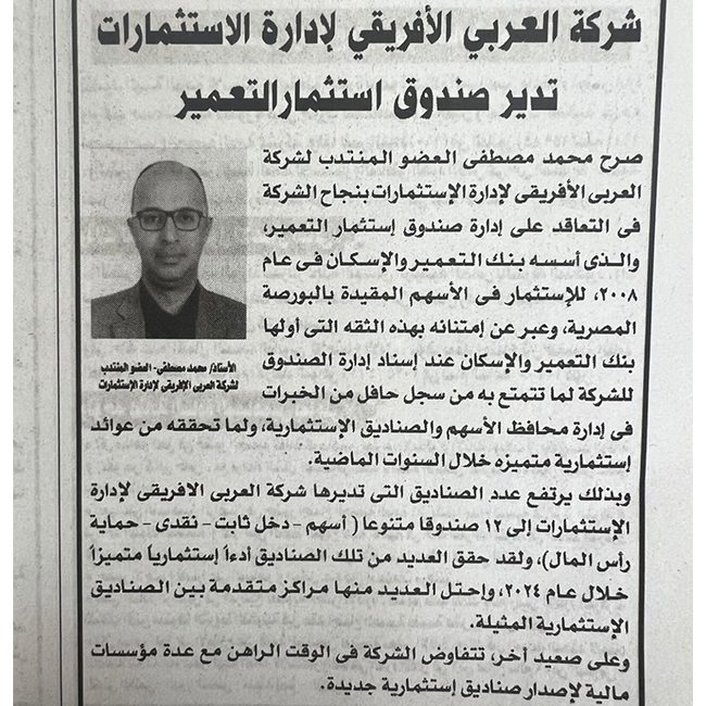 صرح محمد مصطفى العضو المنتدب لشركة العربى الافريقى لادارة الاستثمارات بنجاح الشركة فى التعاقد على ادارة صندوق استثمار التعمير، والذى اسسه بنك التعمير والاسكان فى عام 2008، للاستثمار فى الاسهم المقيدة بالبورصة المصرية، وعبر عن امتنانه بهذه الثقه التى اولها بنك التعمير والاسكان عند اسناد ادارة الصندوق للشركة لما تتنتع به من سجل حافل من الخبرات فى ادارة محافظ الاسهم والصناديق الاستثمارية، ولما تحققه من عوائد استثمارية متميزه خلال السنوات الماضية.